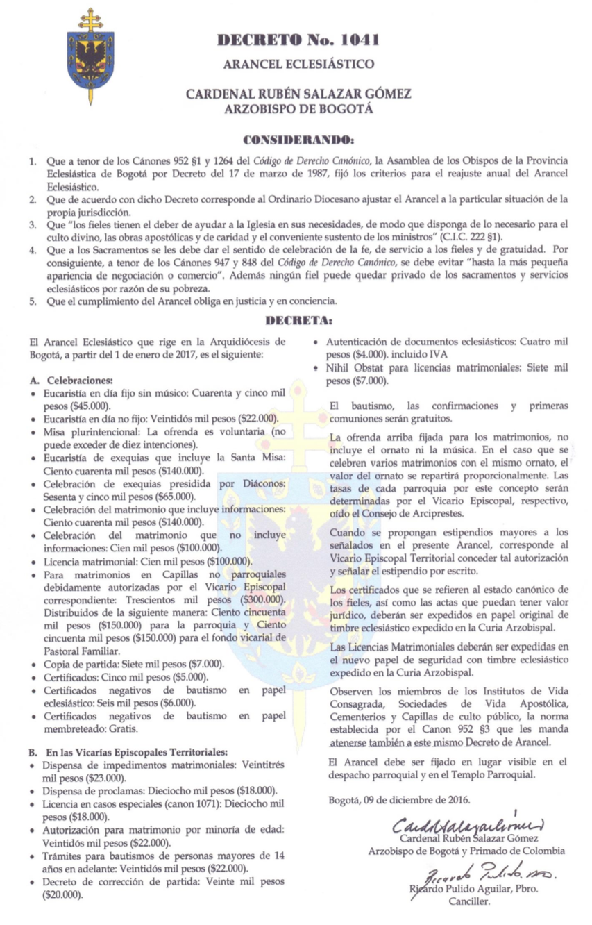 Centro de información Yo quiero Noticias Boletines Eventos Artículos Canonización Mensajes del Señor Cardenal Cartas pastorales Homilías Mensajes La voz del pastor Documentos del Vaticano BoletinesArancel Eclesiástico 15 de Diciembre de 2016 El señor cardenal Rubén Salazar Gómez ha expedido el decreto anual del Arancel eclesiástico Like 0 Dislike 0 Últimos boletines El Señor Cardenal Pedro Rubiano Sáenz descansa en la Casa del Padre 15 de Abril de 2024Elevamos plegarias al Señor de la vida como Iglesia arquidiocesana por el Cardenal Pedro, y oramos para que el Padre lo acoja en su Reino Nombramientos en la Arquidiócesis de Bogotá26 de Marzo de 2024La cancillería arquidiocesana comunica los siguientes nombramientos: