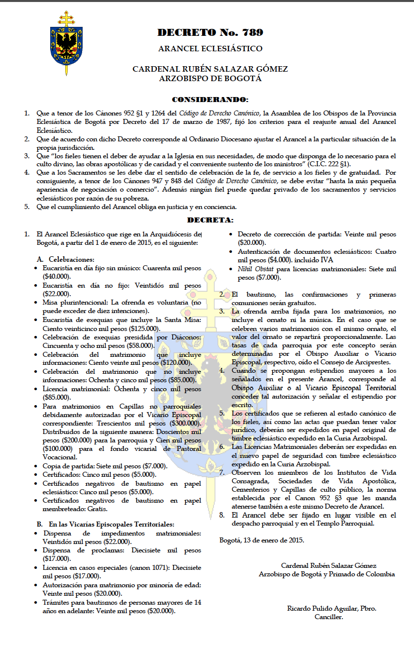 Centro de información Yo quiero Noticias Boletines Eventos Artículos Canonización Mensajes del Señor Cardenal Cartas pastorales Homilías Mensajes La voz del pastor Documentos del Vaticano BoletinesArancel Eclesiástico 2015 15 de Enero de 2015 El Arancel Eclesiástico que rige en la Arquidiócesis de Bogotá, a partir del 1 de enero de 2015, es el siguiente: Descargue a continuación el Arancel Eclesiástico 2015 undefinedDescargar Like 0 Dislike 0 Últimos boletines El Señor Cardenal Pedro Rubiano Sáenz descansa en la Casa del Padre 15 de Abril de 2024Elevamos plegarias al Señor de la vida como Iglesia arquidiocesana por el Cardenal Pedro, y oramos para que el Padre lo acoja en su Reino Nombramientos en la Arquidiócesis de Bogotá26 de Marzo de 2024La cancillería arquidiocesana comunica los siguientes nombramientos: