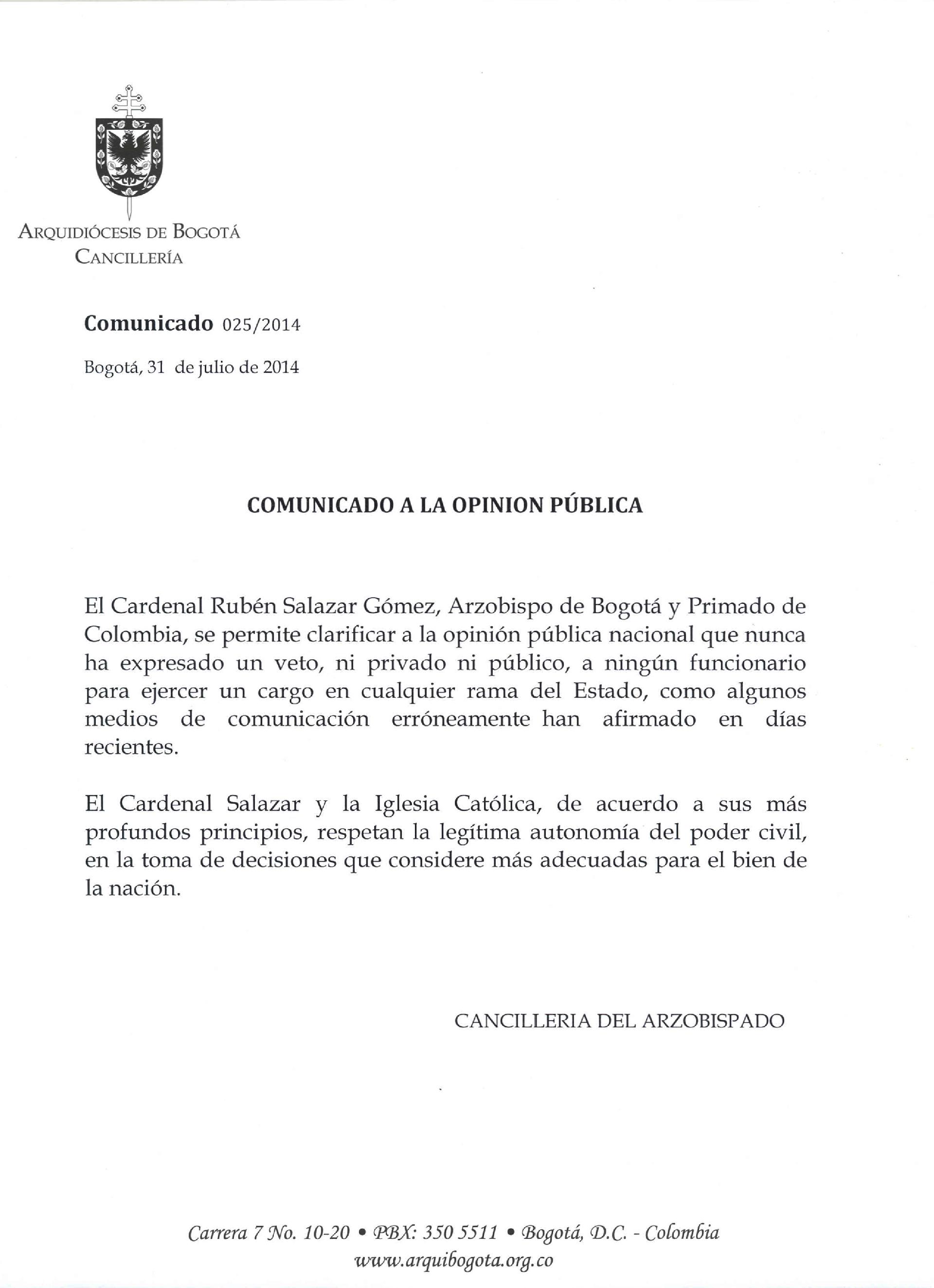 Centro de información Yo quiero Noticias Boletines Eventos Artículos Canonización Mensajes del Señor Cardenal Cartas pastorales Homilías Mensajes La voz del pastor Documentos del Vaticano BoletinesComunicado a la opinión pública, 31 de julio 2014 31 de Julio de 2014 " Nunca he expresado un veto, ni privado ni público, a ningún funcionario para ejercer un cargo en cualquier rama del Estado". Like 0 Dislike 0 Últimos boletines El Señor Cardenal Pedro Rubiano Sáenz descansa en la Casa del Padre 15 de Abril de 2024Elevamos plegarias al Señor de la vida como Iglesia arquidiocesana por el Cardenal Pedro, y oramos para que el Padre lo acoja en su Reino Nombramientos en la Arquidiócesis de Bogotá26 de Marzo de 2024La cancillería arquidiocesana comunica los siguientes nombramientos: