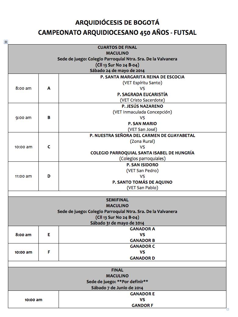 Centro de información Yo quiero Noticias Boletines Eventos Artículos Canonización Mensajes del Señor Cardenal Cartas pastorales Homilías Mensajes La voz del pastor Documentos del Vaticano NoticiasCAMPEONATO ARQUIDIOCESANO 450 AÑOS - FUTSAL20 de Mayo de 2014El próximo sábado 24 de mayo, en los Colegios Parroquiales Nuestra Señora de la Valvanera y San Luis Gonzaga, retomaremos el campeonato de Futsal con ocasión de los 450… Guillermo Rodríguez Parroquia Madre Laura Like 0 Dislike 0 Noticias relacionadasEste es un ejemplo ✅ Formación introductoria para la actualización de la página web parroquial Unidos en oración