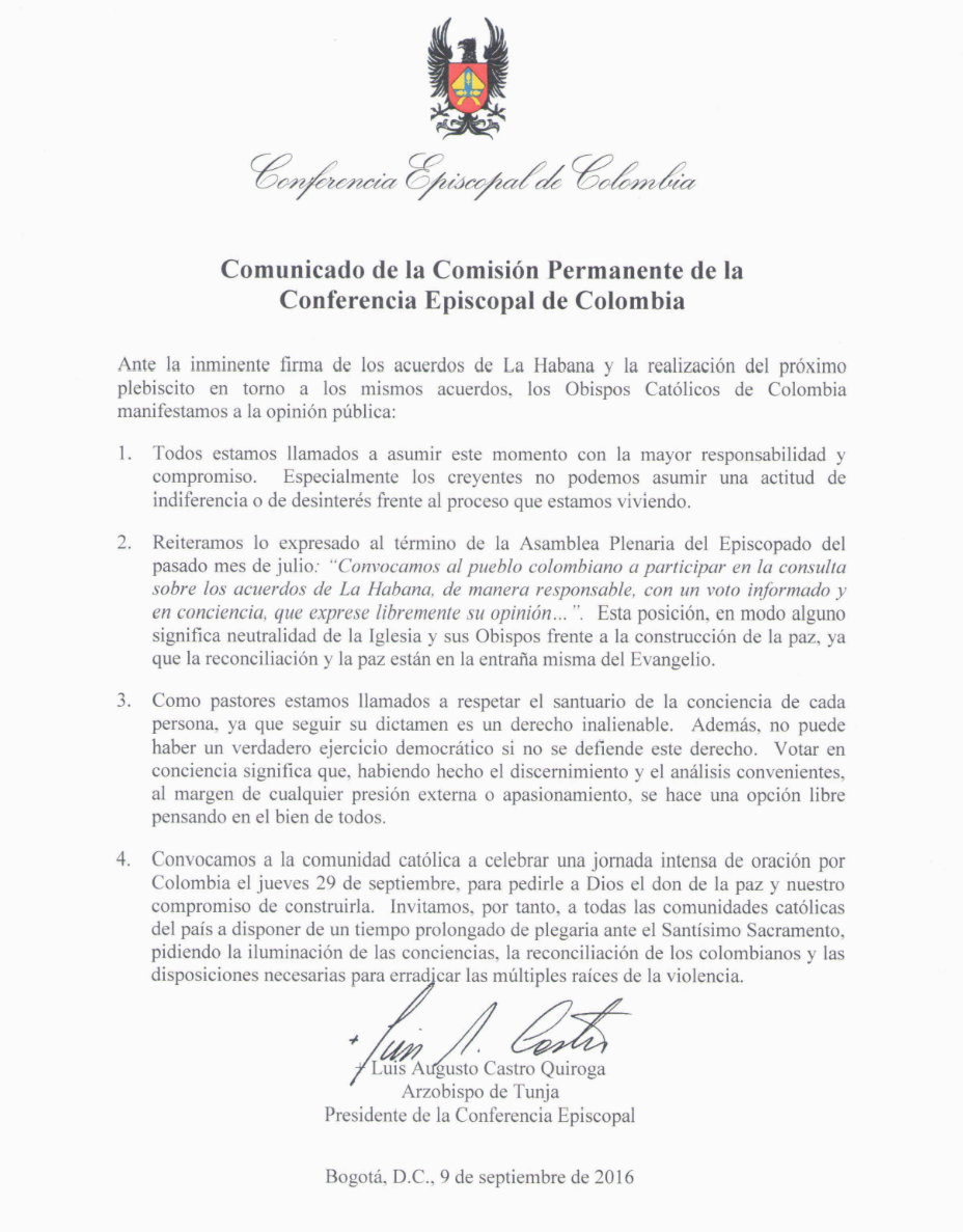 Centro de información Yo quiero Noticias Boletines Eventos Artículos Canonización Mensajes del Señor Cardenal Cartas pastorales Homilías Mensajes La voz del pastor Documentos del Vaticano NoticiasComunicado de la Comisión Permanente de la Conferencia Episcopal de Colombia9 de Septiembre de 2016Ante la inminente firma de los acuerdos de La Habana y la realización del próximo plebiscito en torno a los mismos acuerdos, los Obispos Católicos de Colombia…Imagen: www.comisiondeconciliacion.co Like 0 Dislike 0 Noticias relacionadasEste es un ejemplo ✅ Formación introductoria para la actualización de la página web parroquial Unidos en oración
