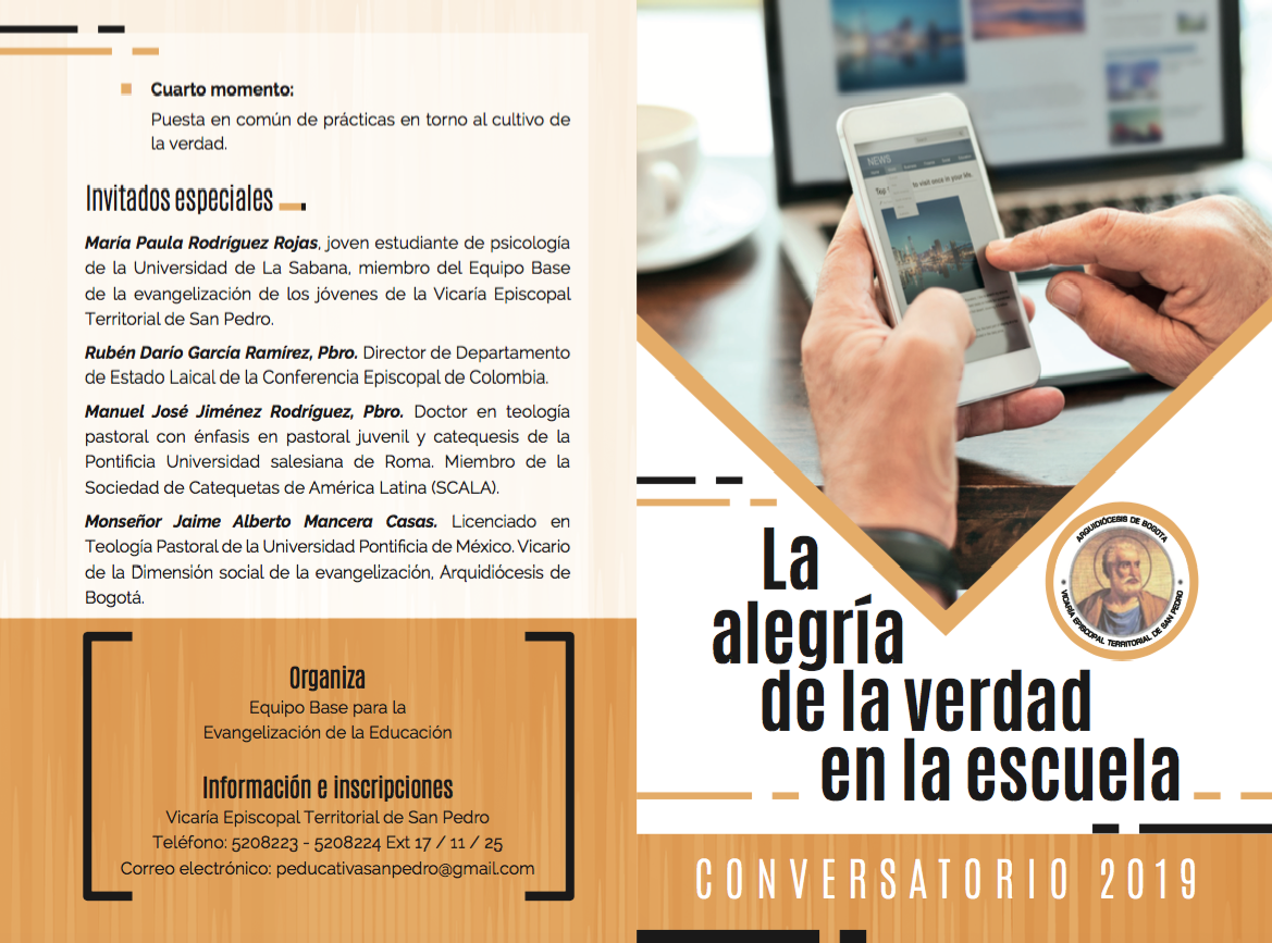 Invita a los Colegios de primaria y bachillerato del territorio de la Vicaría Episcopal de San Pedro al Conversatorio 2019: “La alegría de la verdad en la Escuela”.