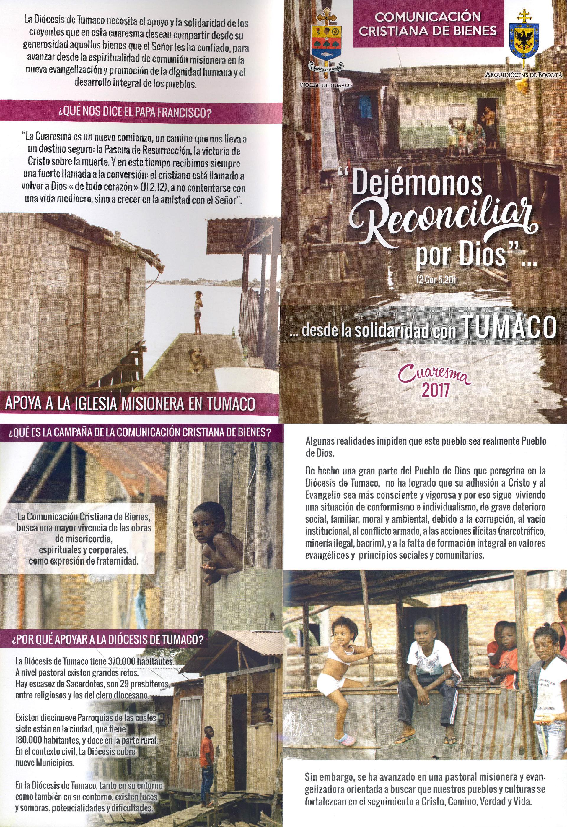 La Diócesis de Tumaco, necesita el apoyo y solidaridad de los creyentes que en esta cuaresma desean compartir desde su generosidad aquellos bienes que el Señor les ha confiado, para avanzar desde el espíritu de comunión misionera en la nueva evangelización y promoción de la dignidad humana y el desarrollo integral de los pueblos.