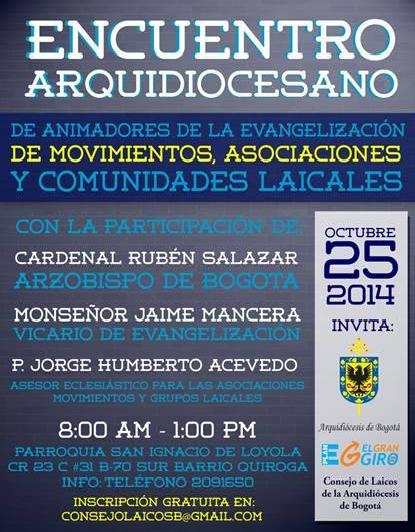 Este evento está siendo convocado por la Vicaría de la Evangelización de la Arquidiócesis de Bogotá y el Consejo de Laicos de la Arquidiócesis de Bogotá en el marco del Plan de Evangelización.