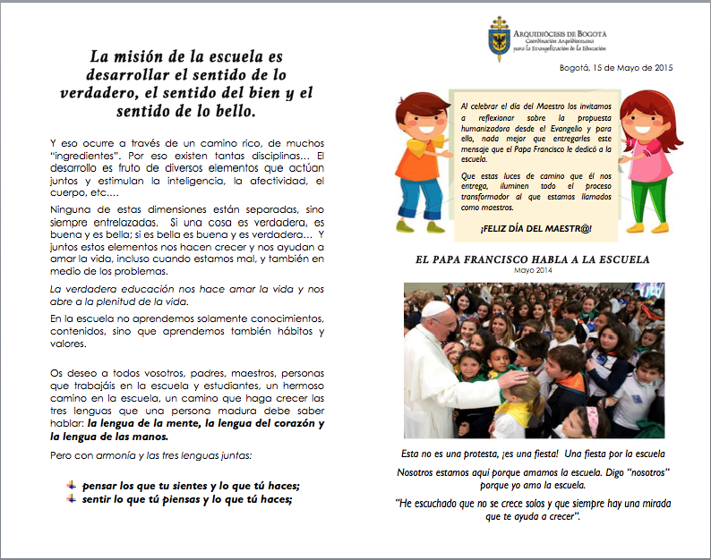Centro de información Yo quiero Noticias Boletines Eventos Artículos Canonización Mensajes del Señor Cardenal Cartas pastorales Homilías Mensajes La voz del pastor Documentos del Vaticano Noticias¡Feliz día del maestro!15 de Mayo de 2015Al celebrar el día del Maestro los invitamos a reflexionar sobre la propuesta humanizadora desde el Evangelio y para ello, nada mejor que entregarles este mensaje que el… Like 0 Dislike 0 Noticias relacionadasEste es un ejemplo ✅ Formación introductoria para la actualización de la página web parroquial Unidos en oración