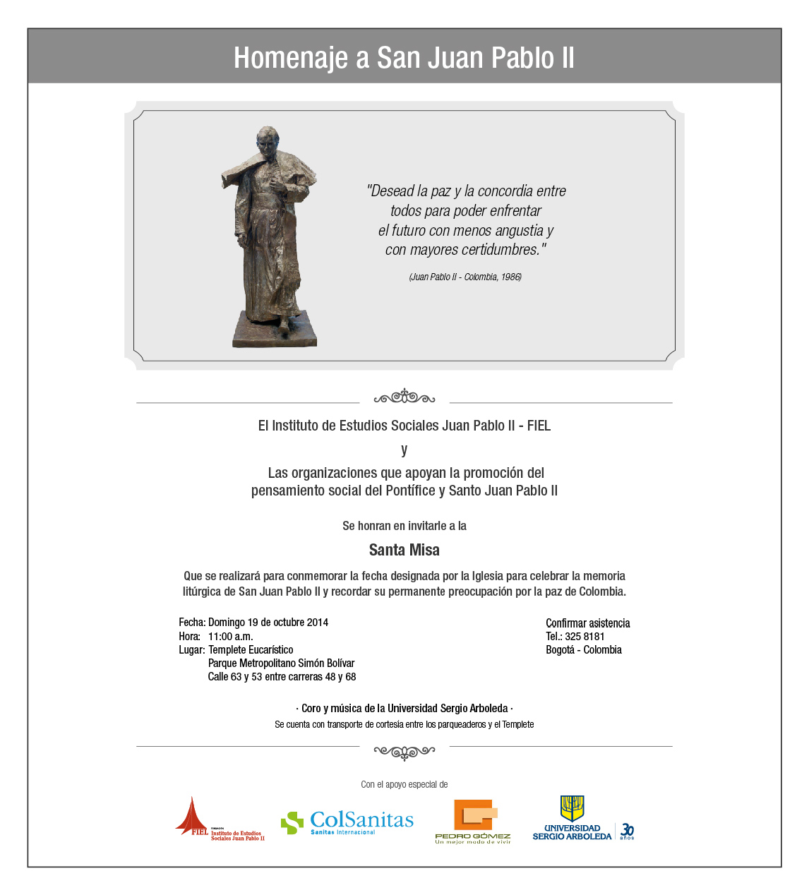 La Santa Misa será el próximo domingo 19 de octubre a las 11:00 a.m. en el Templete Eucarístico del Parque Simón Bolívar, donde se colocó la escultura del Pontífice y donde Su Santidad San Juan Pablo II celebró una Misa en su visita a Colombia en el año de 1986.