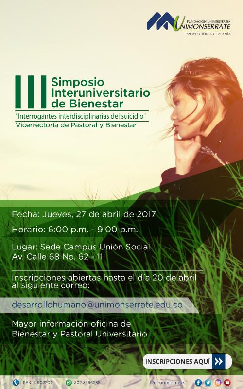 Centro de información Yo quiero Noticias Boletines Eventos Artículos Canonización Mensajes del Señor Cardenal Cartas pastorales Homilías Mensajes La voz del pastor Documentos del Vaticano NoticiasIII Simposio Interuniversitario de Bienestar "Interrogantes interdisciplinarias de suicidio"18 de Abril de 2017Inscripciones abiertas hasta el 20 de abril, mayor información oficina de Bienestar y Pastoral Universitario Like 0 Dislike 0 Noticias relacionadasEste es un ejemplo ✅ Formación introductoria para la actualización de la página web parroquial Unidos en oración