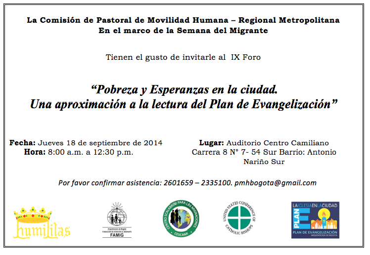 La entrada es gratuita con previa inscripción, mayores informes: pmhbogota@gmail.com - Tel: 2601659 – 2335100 Pastoral de Movilidad Humana Regional Metropolitana de Bogotá.