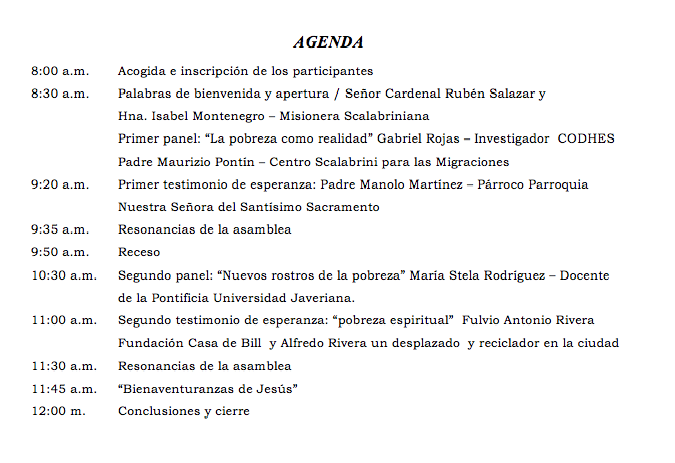 Entre las actividades más importantes para esta semana, está el foro que tiene como tema: “Pobreza y Esperanzas en la ciudad. Una aproximación a la lectura del Plan de Evangelización”, el cual se realizará el jueves 18 de septiembre de 8:00 a.m. a 12:30m en el Centro Camiliano (Carrera. 8 No. 7-54 Sur Barrio Antonio Nariño).