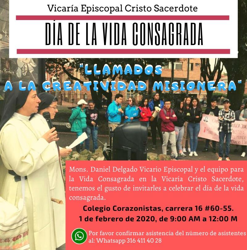 Centro de información Yo quiero Noticias Boletines Eventos Artículos Canonización Mensajes del Señor Cardenal Cartas pastorales Homilías Mensajes La voz del pastor Documentos del Vaticano NoticiasJornada Mundial de la Vida Consagrada31 de Enero de 2020La arquidiócesis de Bogotá, a través de las vicarías episcopales territoriales se une a la conmemoración de la Jornada Mundial de la Vida Consagrada que se celebrará el… Like 0 Dislike 0 Noticias relacionadasEste es un ejemplo ✅ Formación introductoria para la actualización de la página web parroquial Unidos en oración