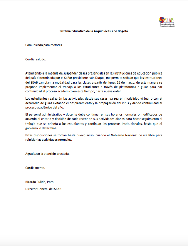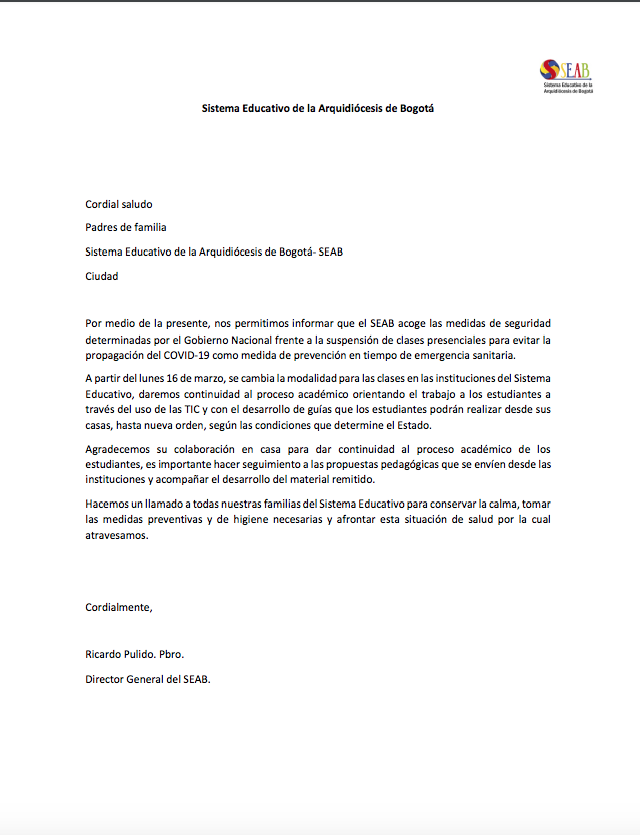 Centro de información Yo quiero Noticias Boletines Eventos Artículos Canonización Mensajes del Señor Cardenal Cartas pastorales Homilías Mensajes La voz del pastor Documentos del Vaticano NoticiasLa dirección general del SEAB informa16 de Marzo de 2020En relación con la Emergencia Sanitaria decretada por el Gobierno Nacional ante situación de salud Pública por COVID-19 el Sistema Educativo de la arquidiócesis de…Comunicado para rectores de colegios Comunicado para padres de familia Like 0 Dislike 0 Noticias relacionadasEste es un ejemplo ✅ Formación introductoria para la actualización de la página web parroquial Unidos en oración