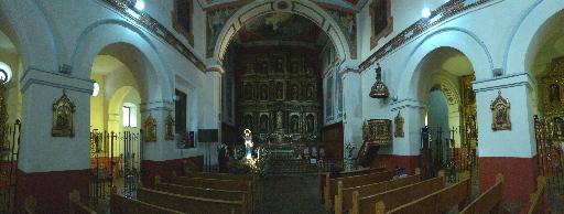 El templo en su interior presenta una nave central acompañada de dos laterales más bajas, divididas en cinco capillas por lado y separadas de la principal por arcos de medio punto. Después del arco toral se encuentra el presbiterio con una cubierta de altura mayor, que es una bóveda extremadamente aligerada que parece plana, la cubierta del sotocoro (parte que queda debajo del coro) presenta una muestra de fino artesonado influenciado por el estilo barroco.