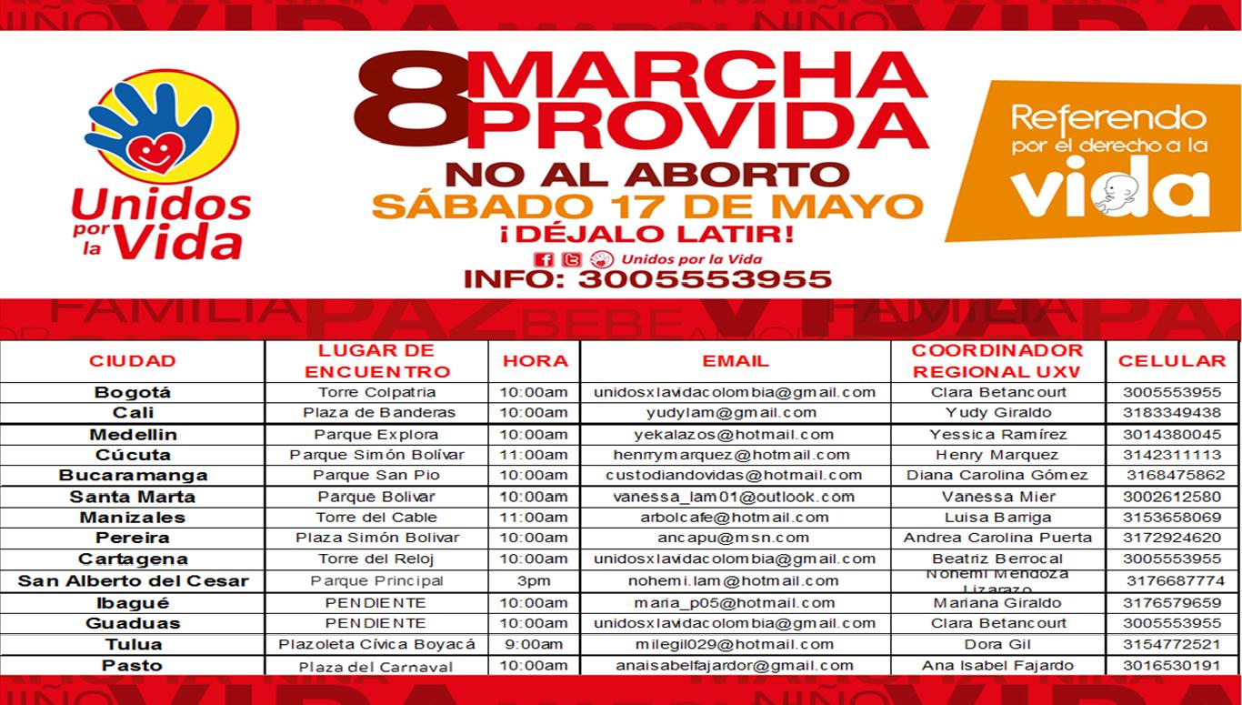 Esta marcha se llevará a cabo el próximo sábado 17 de mayo a las 10:00 a.m. en la Torre Colpatria y cuyo trayecto será hasta la Plaza de Bolívar, simultáneamente se espera que en 22 ciudades del País también se participe de esta importante marcha nacional a favor de las mujeres y de la vida.