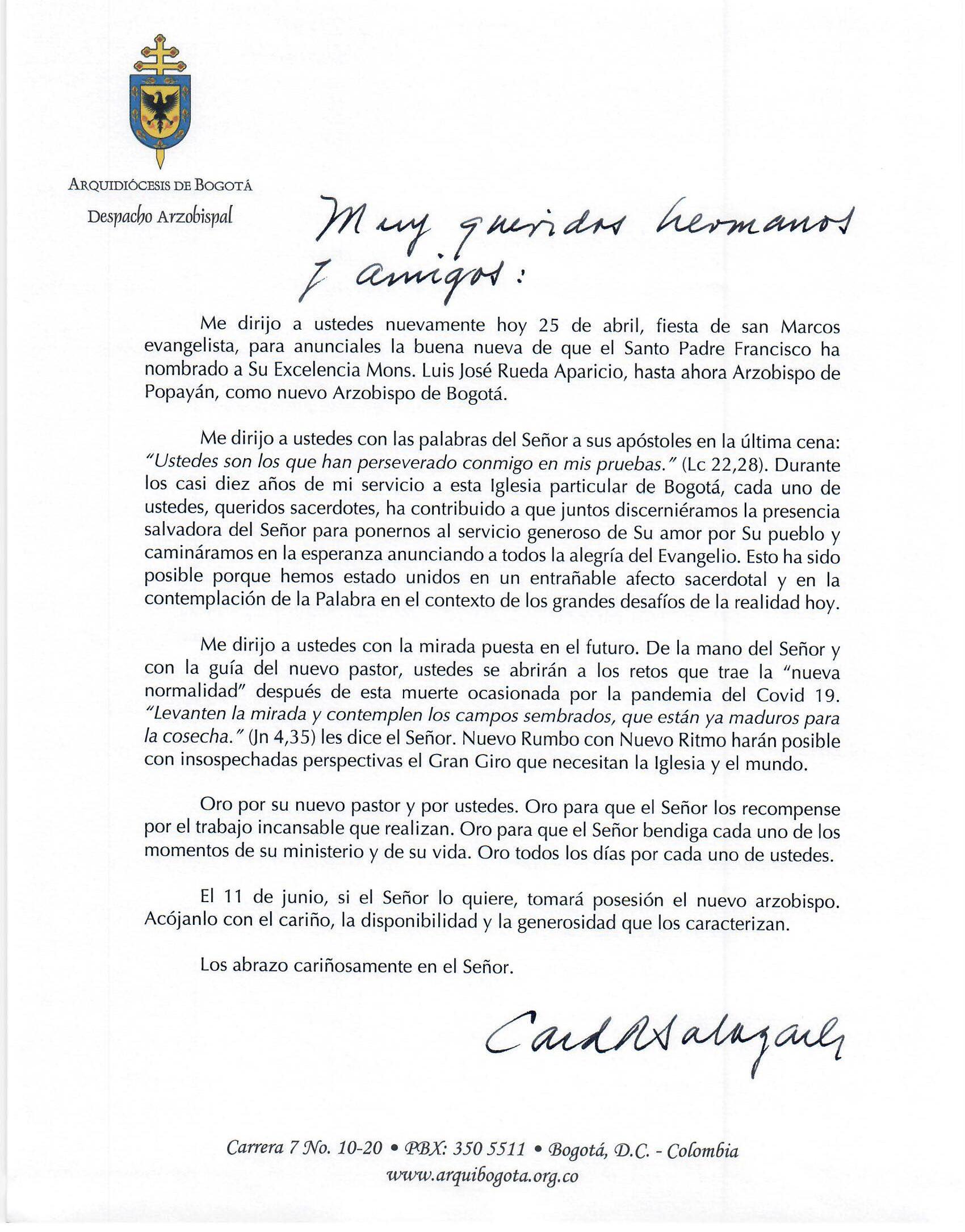 Despidió su misiva manifestando que ora diariamente por cada uno de los sacerdotes de la arquidiócesis de Bogotá, y bendice el trabajo incansable que realizan.