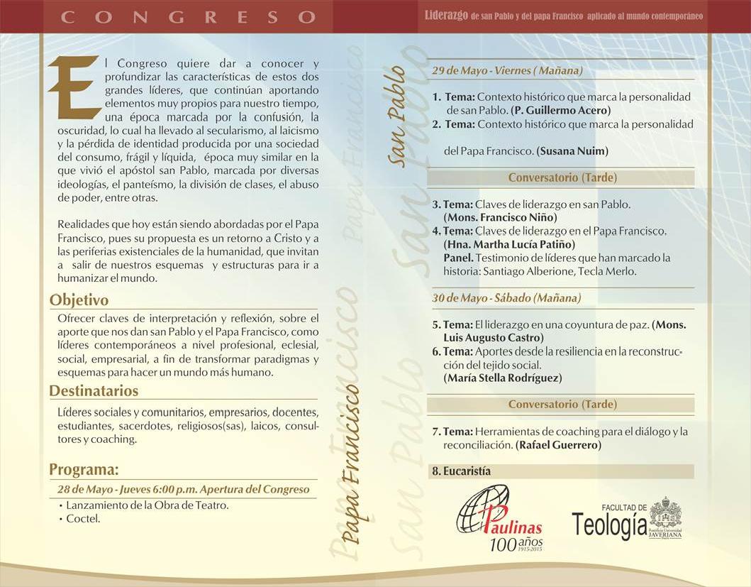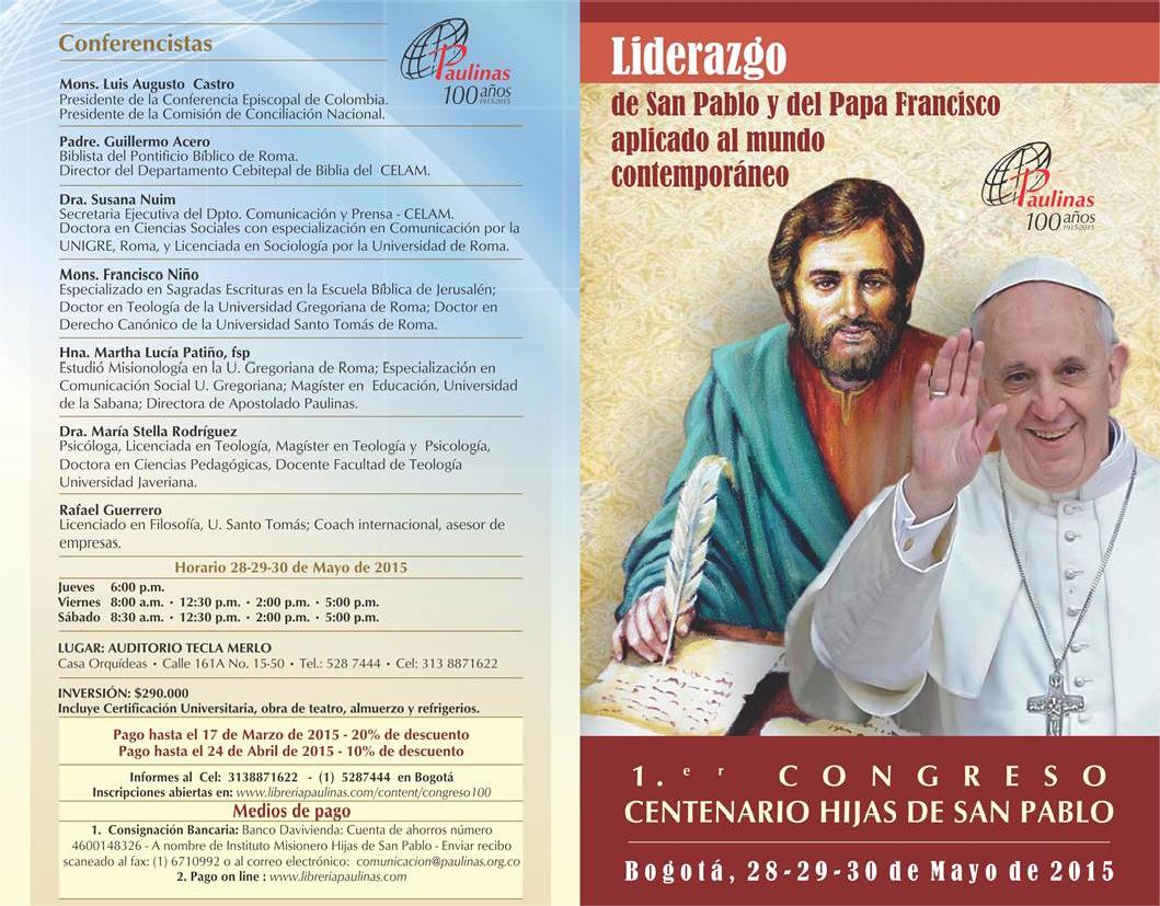 Centro de información Yo quiero Noticias Boletines Eventos Artículos Canonización Mensajes del Señor Cardenal Cartas pastorales Homilías Mensajes La voz del pastor Documentos del Vaticano NoticiasPrimer Congreso: Liderazgo de San Pablo y del Papa Francisco aplicado al mundo contemporaneo27 de Mayo de 2015Para mayor información haz clink en el siguiente link: http://libreriapaulinas.com/congreso Like 0 Dislike 0 Noticias relacionadasEste es un ejemplo ✅ Formación introductoria para la actualización de la página web parroquial Unidos en oración