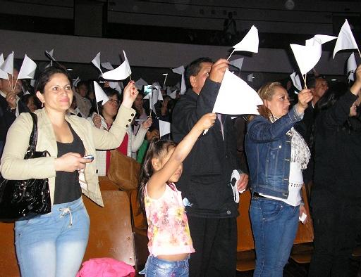La invitación a ponerse de pie ondeando banderas de color blanco fue el siguiente acto como un gesto de aquellas personas que anhelamos la paz, mientras Edwin Jesús cantante y compositor interpretaba la canción Himno tierra de paz.