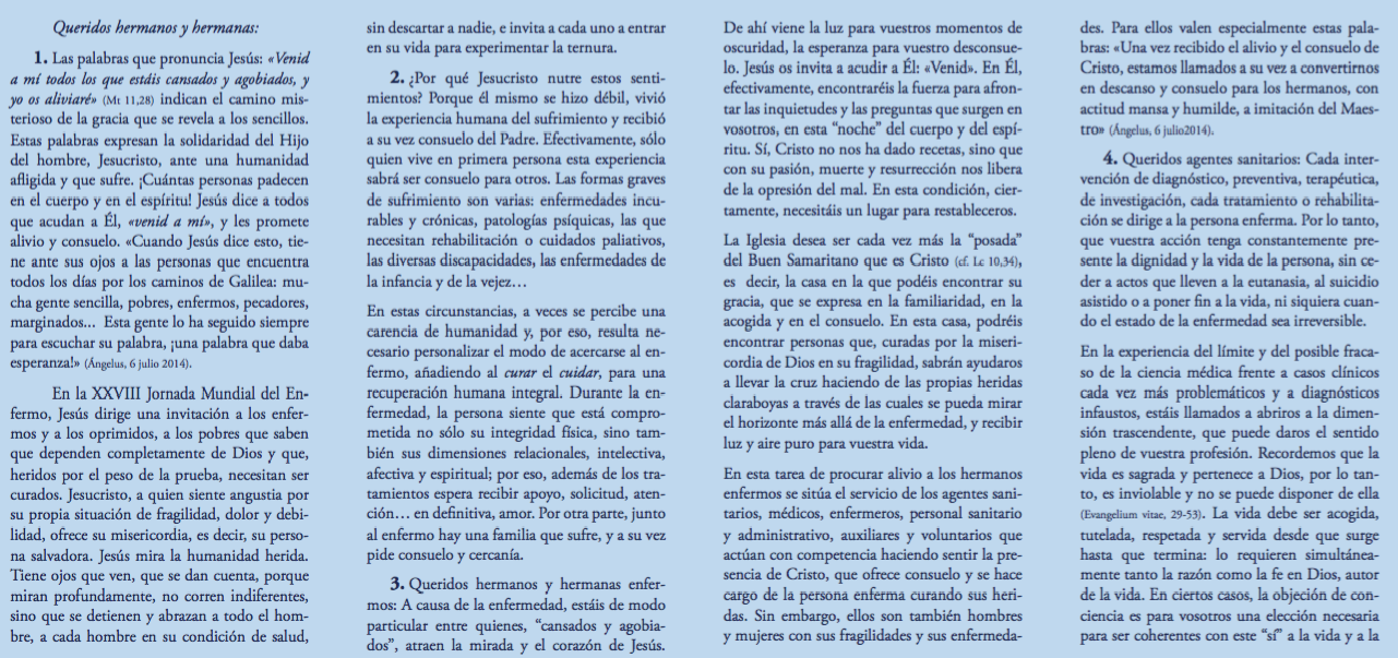 Centro de información Yo quiero Noticias Boletines Eventos Artículos Canonización Mensajes del Señor Cardenal Cartas pastorales Homilías Mensajes La voz del pastor Documentos del Vaticano NoticiasXXVIII Jornada mundial del enfermo, mensaje del Santo Padre Francisco11 de Febrero de 2020 Like 0 Dislike 0 Noticias relacionadasEste es un ejemplo ✅ Formación introductoria para la actualización de la página web parroquial Unidos en oración